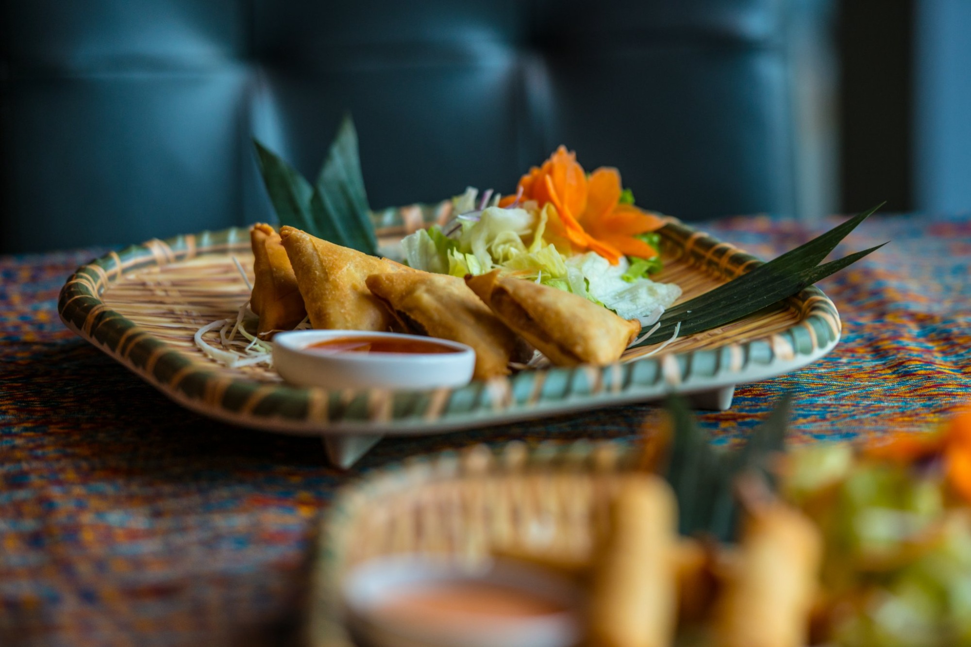 Samosa z kurczakiem i warzywami, spring rolls z kurczakiem i warzywami, pierożki smażone z wieprzowiną, szaszłyki z kurczaka